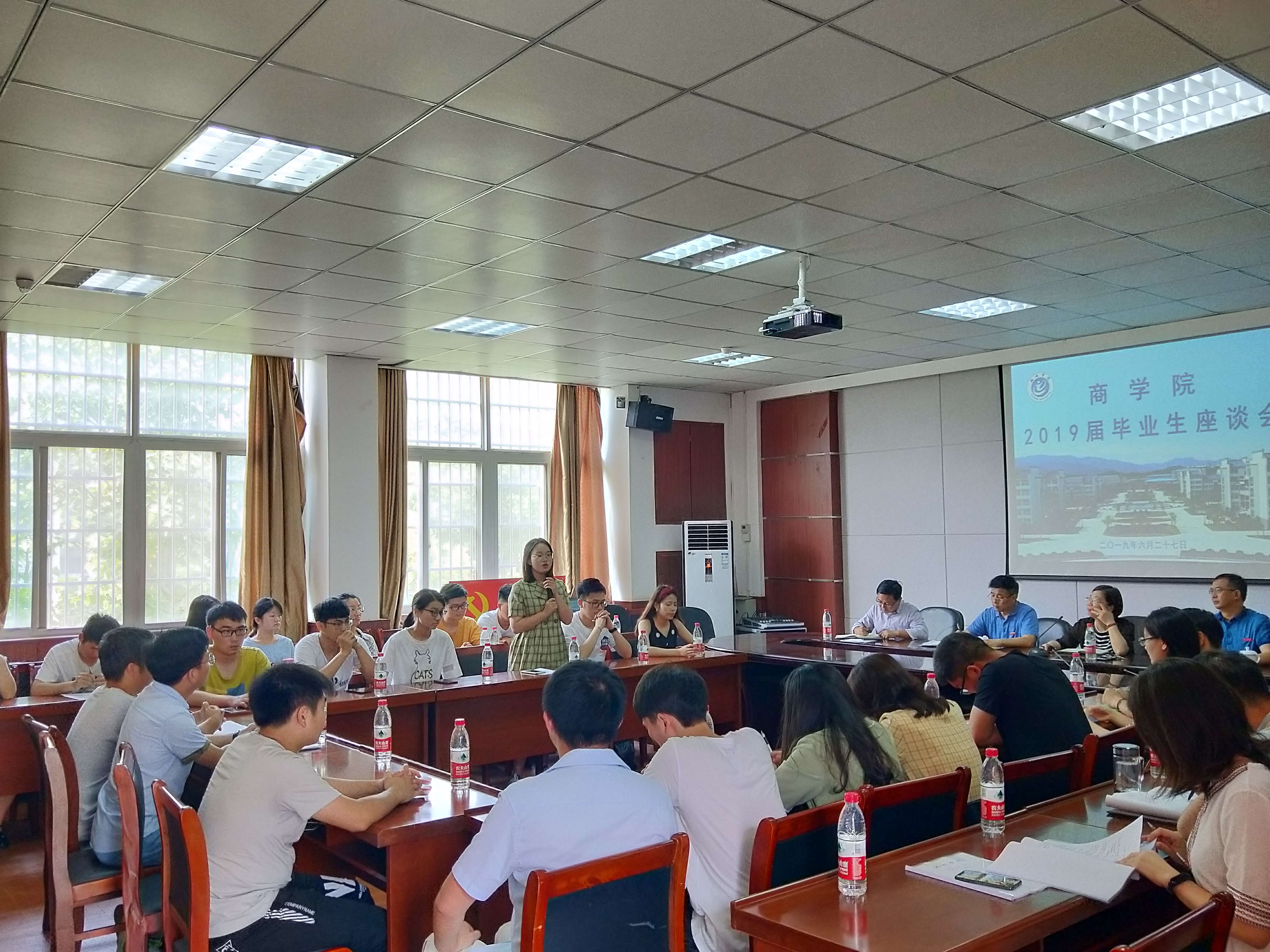 为深入开展毕业生安全文明离校及感恩教育,积极营造“安全、文明、和谐、温馨”的毕业氛围。6月27日上午,商学院在会议室举行了2019届毕业生代表座谈会。学院党政领导、实训中心主任、团总支书记、教研室主任、毕业班辅导员、2019届毕业生代表及2016级学生代表参加了座谈会。座谈会由商学院院长项桂娥主持。