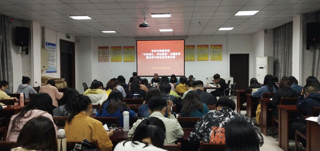 10月14日晚,文学与传媒学院党委在博物楼第一会议室举办“不忘初心、牢记使命”主题教育理论学习学生党员读书班活动。院党委书记许思友、学生第三支部书记方天宝、全体学生党员参加了读书班活动,活动由院党委书记许思友主持。