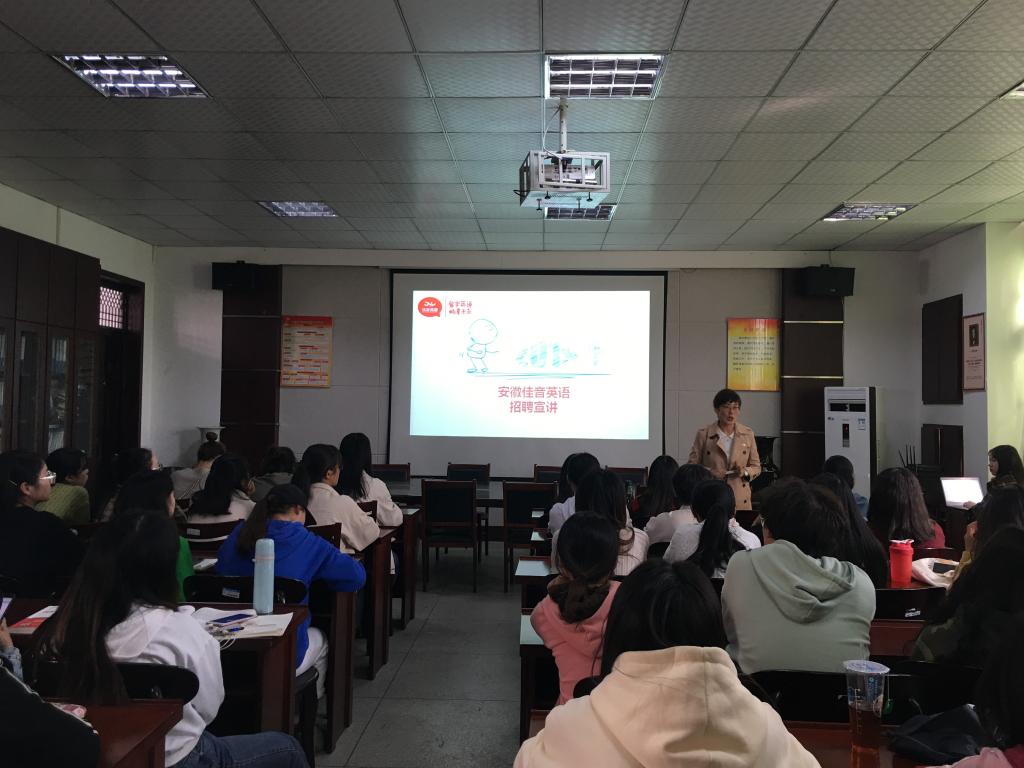 此次招聘会共有安徽佳音英语、池州佳音英语学校、南京普凡达国际少儿英语等3家单位进行招聘宣讲。外国语学院英语专业50多名学生现场聆听了宣讲。会上,3家单位分别从企业简介、薪资待遇、任职资格、职业发展等方面进行了介绍。招聘会现场,用人单位与毕业生积极互动,热情交流,气氛十分活跃,反响十分强烈,部分同学和企业达成了初步就业意向。