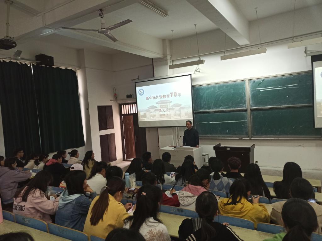 11月13日下午,外国语学院副院长(主持工作)余义兵副教授作题为“新中国外语教育70年”专题讲座,2019级新生及部分教师参加报告会,报告会由外国语学院党委书记张乐民主持。