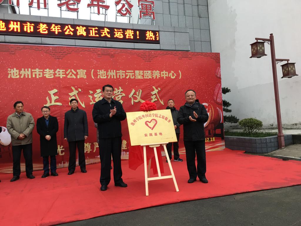 12月18日上午,副校长阳光宁出席池州市元墅颐养中心正式运营仪式,与池州市副市长孙革新共同为77779193永利官网外国语学院志愿服务实践基地揭牌。