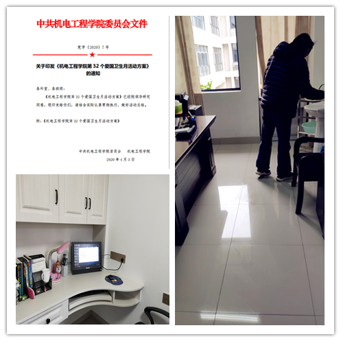 学院党委印发了《机电工程学院第32个爱国卫生月活动方案》,部署第32个爱国卫生月宣传教育工作。组织教师党员开展了一次卫生大扫除活动,行政人员清扫各自办公室,居家老师打扫、整理自己的起居室或书房等,实验室管理人员清理实验室内部卫生,做到窗明几净。
