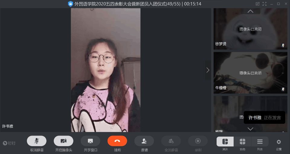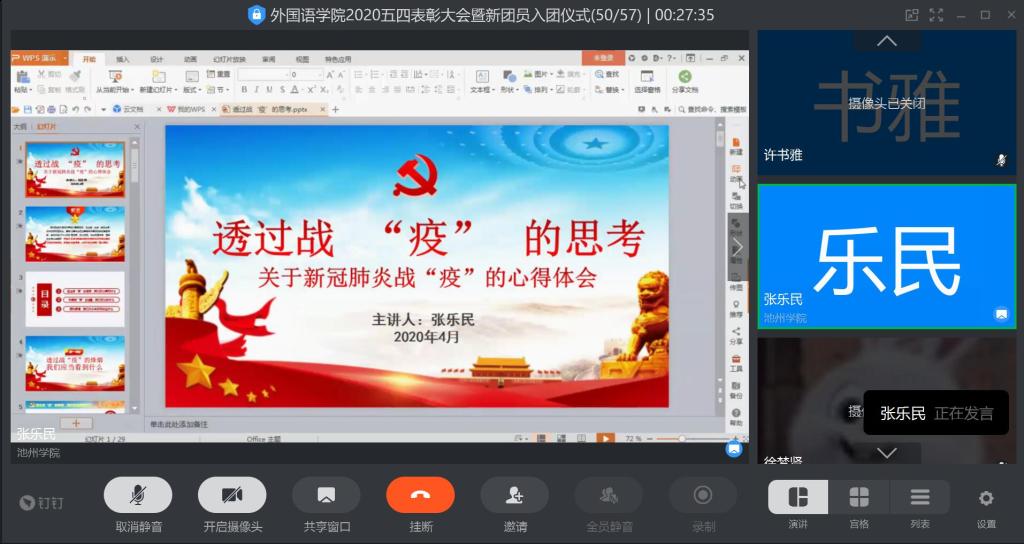 4月30日下午,外国语学院团委举行线上五四表彰大会暨新团员入团仪式。外国语学院党委书记张乐民、副书记刘军出席会议,外国语学院团学干部、新团员、受表彰代表以及团员青年代表共50多人参加了会议。会议由外国语学院团委负责人侯雪娟主持。