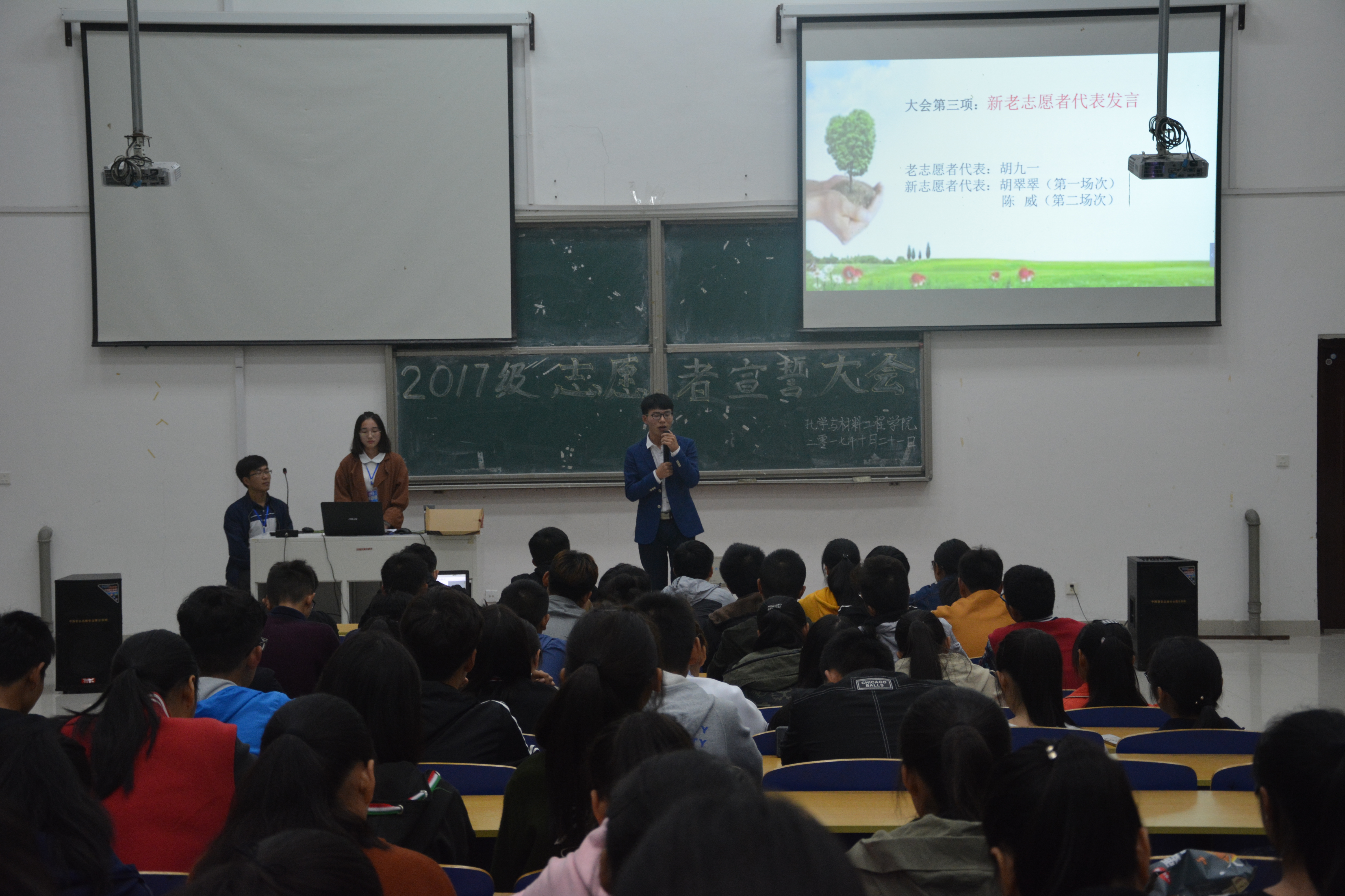 为更好地深化志愿活动,进一步加强志愿队伍的组织建设和规范管理。10月21日晚,化学与材料工程学院于逸夫楼阶梯教室举行2017级新生志愿者宣誓大会,化材学院全体新生参加了本次活动,会议由化材学院青协分会负责人佘春莹主持。