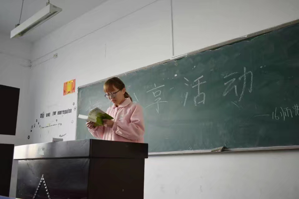 2016级英语(师范)3班团支部开展读书分享会,每位同学上台阅读一段自己喜欢的书籍中的文字,并讲述自己喜欢阅读的理由、分享阅读的经验。