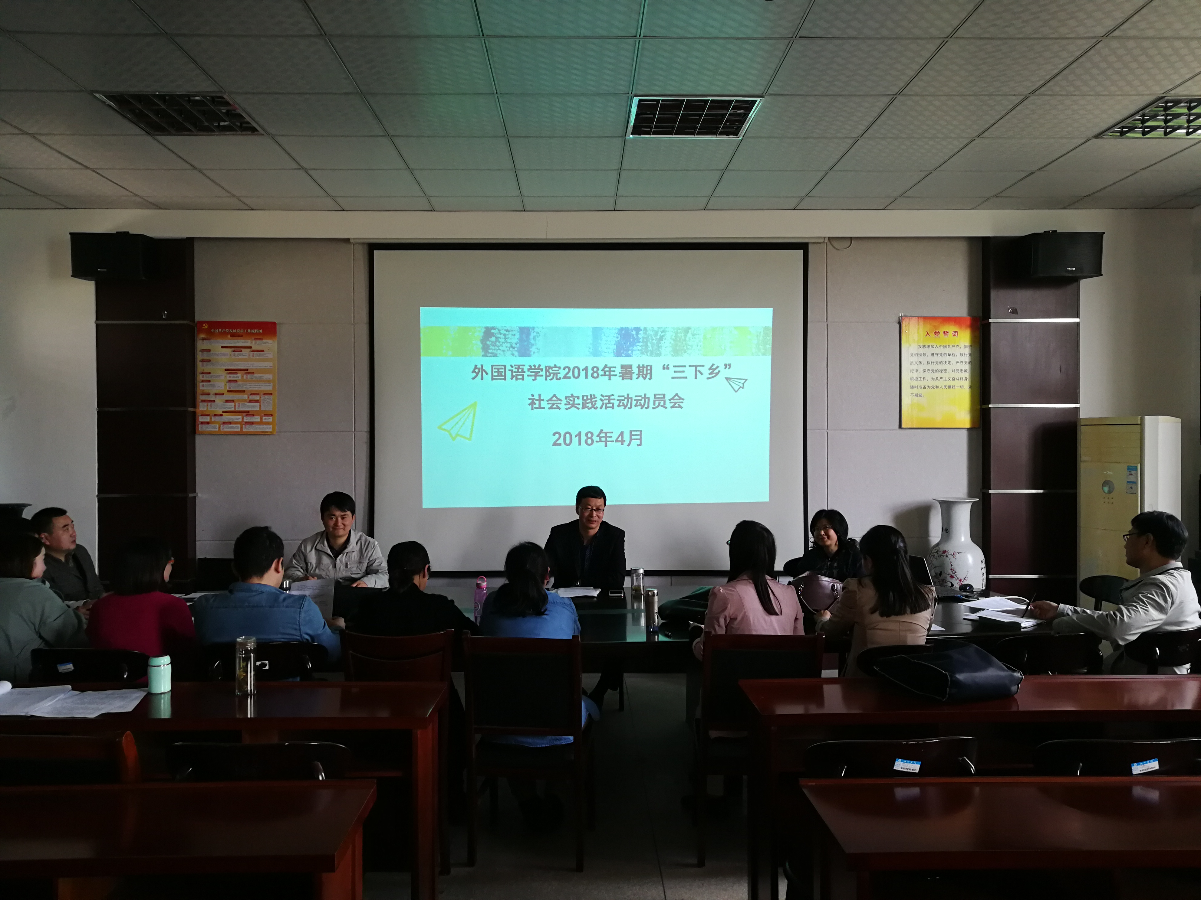 4月18日下午,外国语学院在会议室举行2018年暑期“三下乡”社会实践工作动员布置会议。出席会议的有外国语学院党总支书记张乐民、院长助理刘军及相关工作负责人,会议由外国语学院党总支副书记冯淑慧主持。