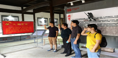 在四岭村院冲杨村民组新四军七师沿江团团部旧址纪念馆,支部成员参观了大量的历史文物和珍贵照片,深刻地感受了革命前辈对党的绝对忠诚和责任担当。支部一行人在党旗下重温了入党誓词,表达了对党绝对忠诚的政治信念。