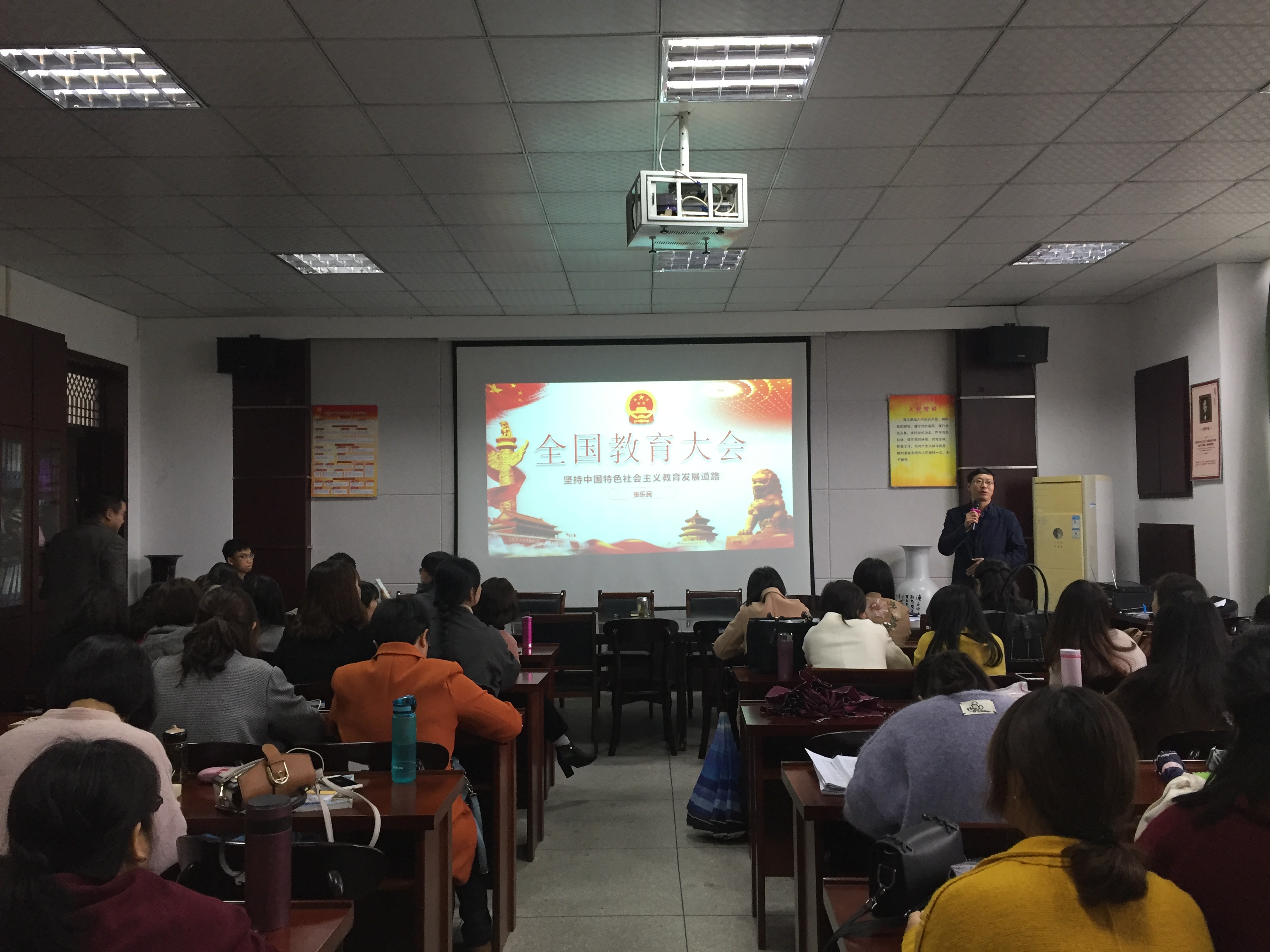 会上,张乐民以“学习全国教育大会精神,坚持中国特色社会主义教育发展道路”为题进行了宣讲。他从全国教育大会简介、习总书记重要讲话全文解读、李克强重要讲话和习近平关于教育十大“金句”等五个方面进行了宣讲。通过宣讲,外国语学院教师认识到学习贯彻全国教育大会精神的重要性,深刻感受到全面加强党对教育工作领导的必要性,明确了新时期高校教师的新任务和新使命,增加了教师队伍的凝聚力和爱岗敬业精神。