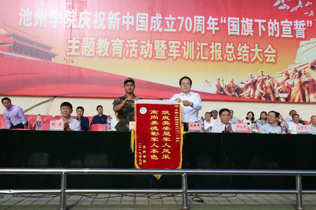 孙晓峰代表学校向承训部队赠送锦旗,对承训部队的大力支持表示衷心的感谢,对参训教官雷厉风行的军人作风、忘我工作的奉献精神表示由衷的敬意。他希望每位新生要将在军训中培养的坚韧不拔的优良品质、团结友爱的集体主义精神,良好的思想政治素养和自我管理能力融入到今后的大学生涯,要像朝阳一样充满活力,在青春的舞台上大有作为,77779193永利官网因此而更加生机勃勃,更加精彩辉煌!