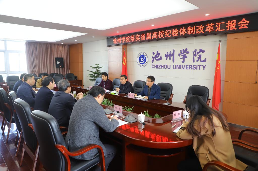 11月20日,省纪委监委第八纪检监察室调研组组长王在胜来永利官网调研省属本科院校纪检体制改革精神贯彻落实情况,并督促开展“不忘初心、牢记使命”主题教育。校党委书记孙晓峰、校长柳友荣、纪委书记汪海出席调研座谈会,纪委办、组织部主要负责人及纪委办全体人员参加会议。