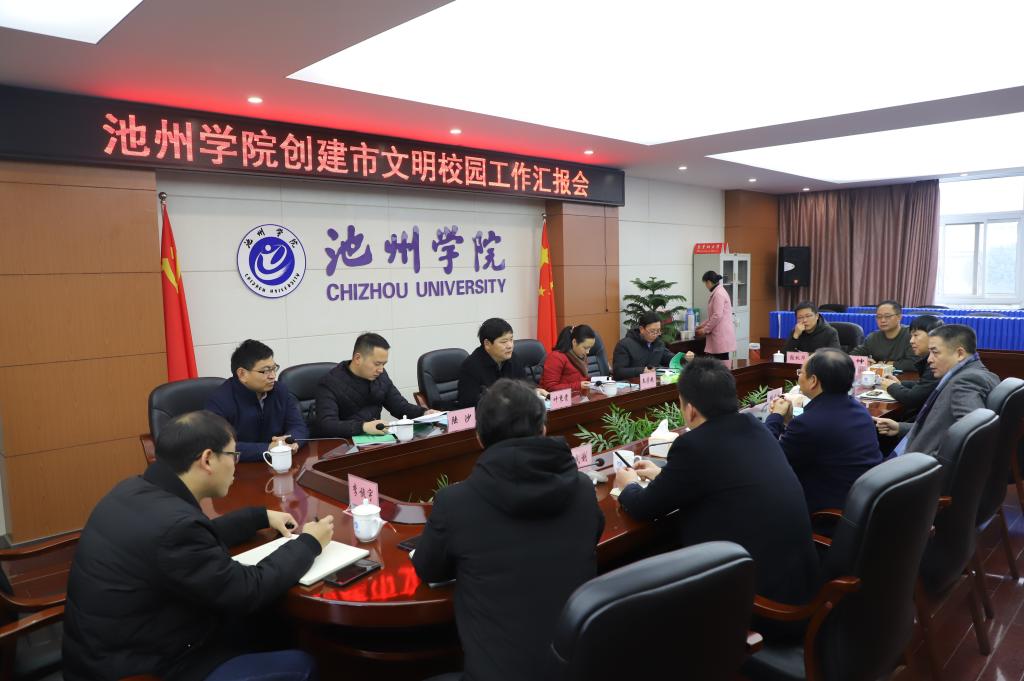 12月19日上午,池州市文明办副主任叶秉贵一行到永利官网检查考核市文明校园创建工作,校长柳友荣、副校长王延寿出席汇报会,办公室、宣传部、学生处、后勤管理与基建处、保卫处、团委等相关部门负责人参加活动。