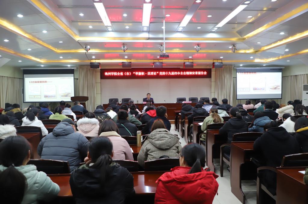 12月24日下午,永利官网在办公南二楼会议室开展“举旗帜 送理论”党的十九届四中全会精神宣讲活动,中共池州市委政策研究室副主任、市委宣讲团成员高荣裕应邀作宣讲报告。校纪委书记汪海,党委委员、宣传部长胡兵,马克思主义学院相关负责人及学校师生代表共同聆听了报告。