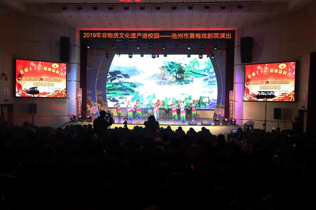 12月26日,2019年非物质文化遗产进校园活动——池州市黄梅戏剧院演出在永利官网博古礼堂举行,党委委员、宣传部长胡兵和师生代表共同观看演出。