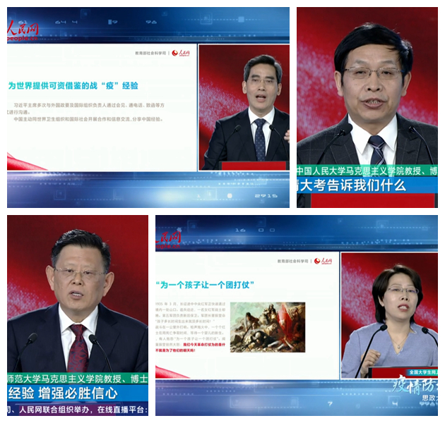 在这堂特别的思政大课上,清华大学教授艾四林、中国人民大学教授秦宣、北京师范大学教授王炳林、中央财经大学教授冯秀军分别结合“马克思主义基本原理概论”、“毛泽东思想和中国特色社会主义理论体系概论”、“中国近现代史纲要”、“思想道德修养与法律基础”必修课教学内容,解读了党中央关于疫情防控的决策部署,分析了中国在抗击疫情中彰显的中国特色社会主义制度的显著优势,讲述了防疫抗疫一线的感人故事,充分发挥高校思政课落实立德树人根本任务的关键课程作用。