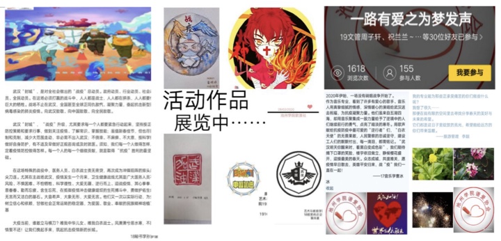 清泉书画社以“阻击疫情”为主题,举办“诗文歌祖国、书画颂温情”书画线上展示活动,吸引了大批同学参与。社团通过新媒体广泛宣传,利用Pu平台发布活动,向全体同学征集书画作品,开展线上评比,并将优秀作品在线上进行分期展示。这些诗文、书画作品表达对武汉人民的关心、对一线医务人员的爱心、对终将战胜疫情的决心,传递着人与人之间的温情。