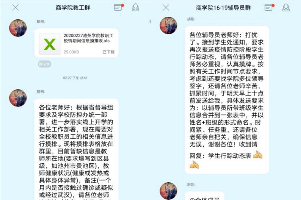 按照学校疫情防控工作的部署,商学院在全院范围内开展疫情全面调查、摸排工作,通过教工钉钉群、学生班级钉钉和辅导员工作群,详细收集、整理全体师生接触疫情情况、身体健康状况,对有特殊情况的师生逐一电话询问,实时监控全体师生的健康状态。学院安排专人每日提醒、督促全体师生按时打卡,以便全面收集师生数据,同时密切关注官方消息,第一时间发送给教师与学生。同时全面启动了全体学生防疫数据统计工作,并坚持每天摸排,实时更新。实行学生情况“日报制度”,了解学生在疫情期间的身心健康状况,同时保证学生不离家、不返校。