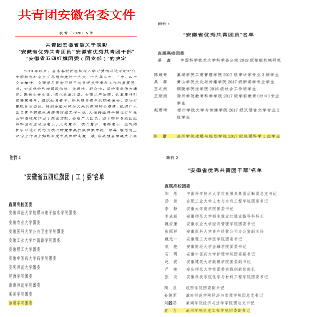 近日,共青团安徽省委下发了《共青团安徽省委关于表彰“安徽省优秀共青团员”“安徽省优秀共青团干部”“安徽省五四红旗团委(团支部)”的决定》(皖青〔2020〕6号)文件,永利官网团委荣获“安徽省五四红旗团委”荣誉称号,机电工程学院团委副书记袁力获“安徽省优秀共青团干部”荣誉称号,地理与规划学院2017级地理科学1班陈蕾获“安徽省优秀共青团员”荣誉称号。