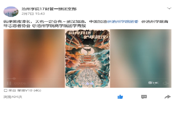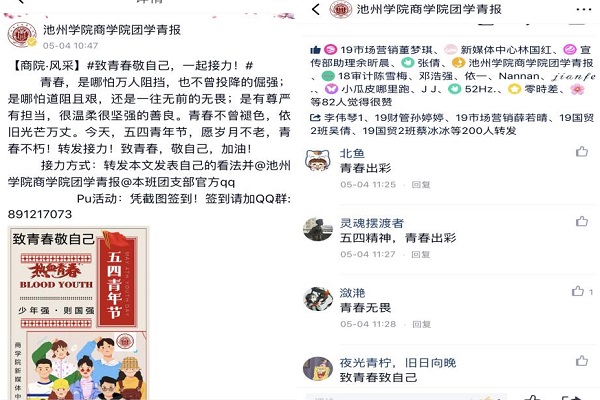 充分利用学院网站、“爱商青春”微信公众号、QQ群、微信群、钉钉群等平台,及时向全体师生传达学习习近平总书记最新关于疫情防控工作的重要讲话和指示批示精神以及学校党委的决策部署,组织开展学习新冠肺炎防护知识,及时跟踪了解上报师生的思想动态及其防控要求,及时宣传疫情防控中涌现出来的先进人物和事迹。组织开展了施咏康同志先进事迹学习活动,广泛开展“五四”运动光荣历史的宣传工作,组织开展了“致青春,敬自己”线上接力活动、五四青年节——红色信息征集活动。发挥网络优势,使战“疫”成为学生学习的大课堂,成长的大熔炉。