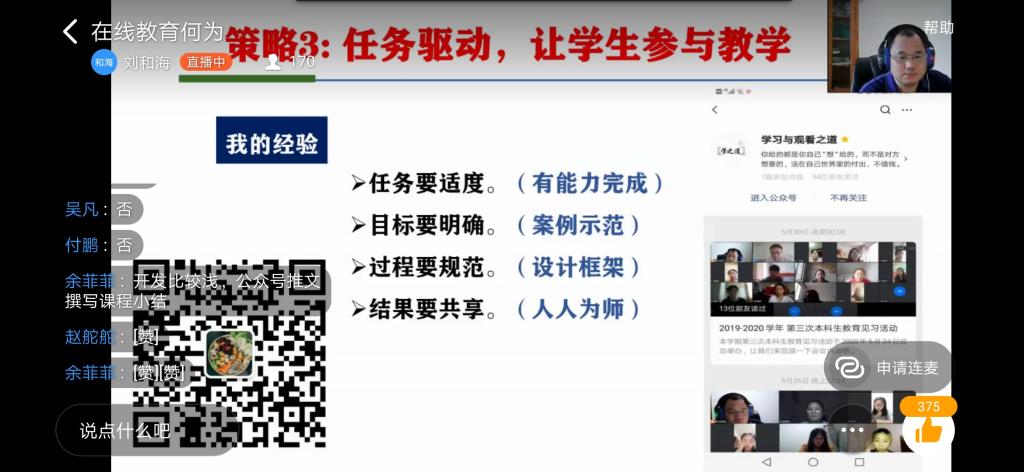 刘和海教授结合自身线上教学经验,结合在线教育问卷与访谈调查的成果剖析了在线教育的现状及存在的问题,围绕信息技术的赋能、学习资源的重构、教师角色的重新定位等视角引导教师对在线教育进行反思。刘和海建议教师线上教学要以内容为王,注重过程设计;以互动为策,注重方法与激励;以任务驱动,让学生真正参与教学。