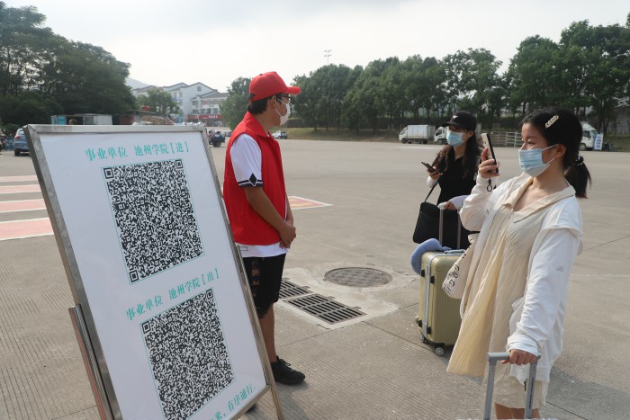 在学校南大门,工作人员指导学生通过扫码、测温、填写信息等环节有序完成返校程序。