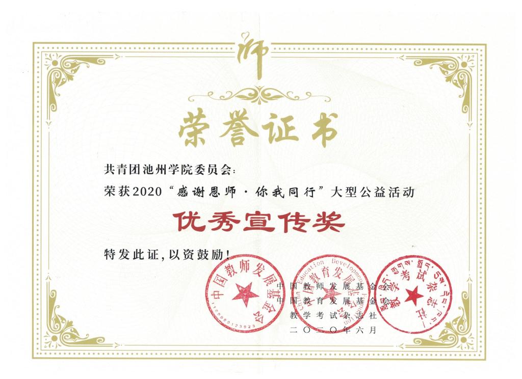 近日,2019年度“感谢恩师·你我同行”大型公益活动圆满结束,永利官网荣获全国“优秀组织奖银奖”、全国“优秀宣传奖”等荣誉称号,文学与传媒学院叶静同学荣获全国“优秀传承奖”,外国语学院周红同学、旅游与历史文化学院陈蓉同学荣获“优秀感恩大使”荣誉称号。