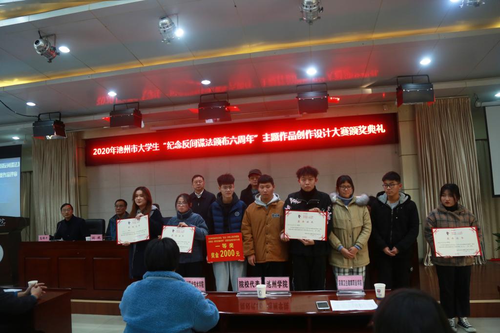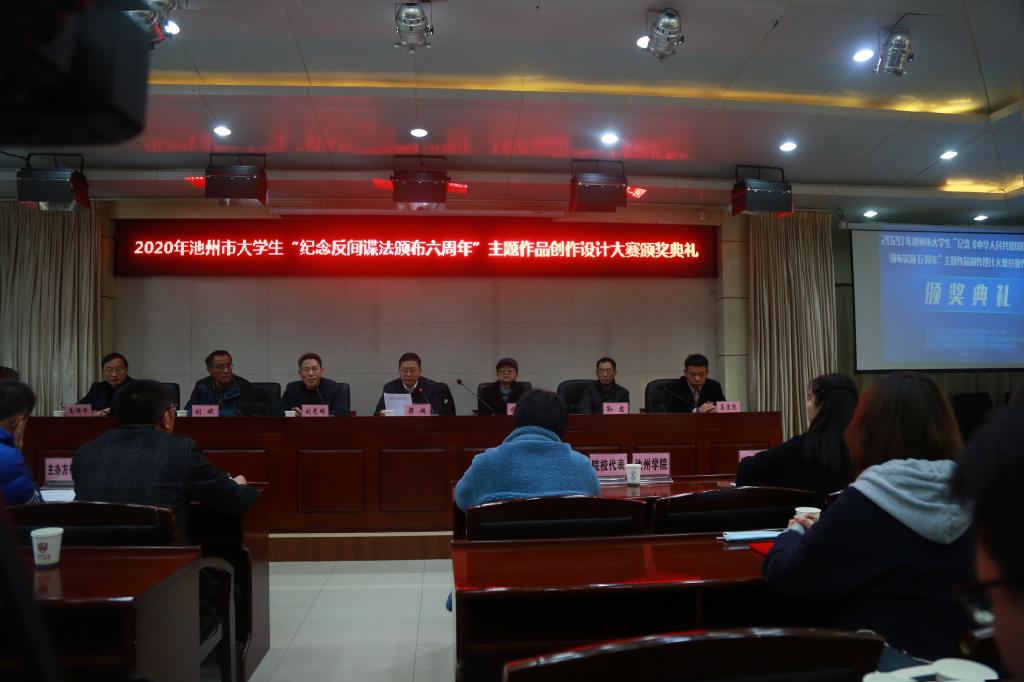 11月30日下午,由池州市法治宣传教育工作领导小组办公室主办,77779193永利官网、池州职业技术学院、安徽卫生健康职业学院承办,池州市广告协会协办的2020年池州市大学生“纪念反间谍法颁布六周年”主题作品创作设计大赛颁奖典礼在永利官网行政南二楼会议室举行。