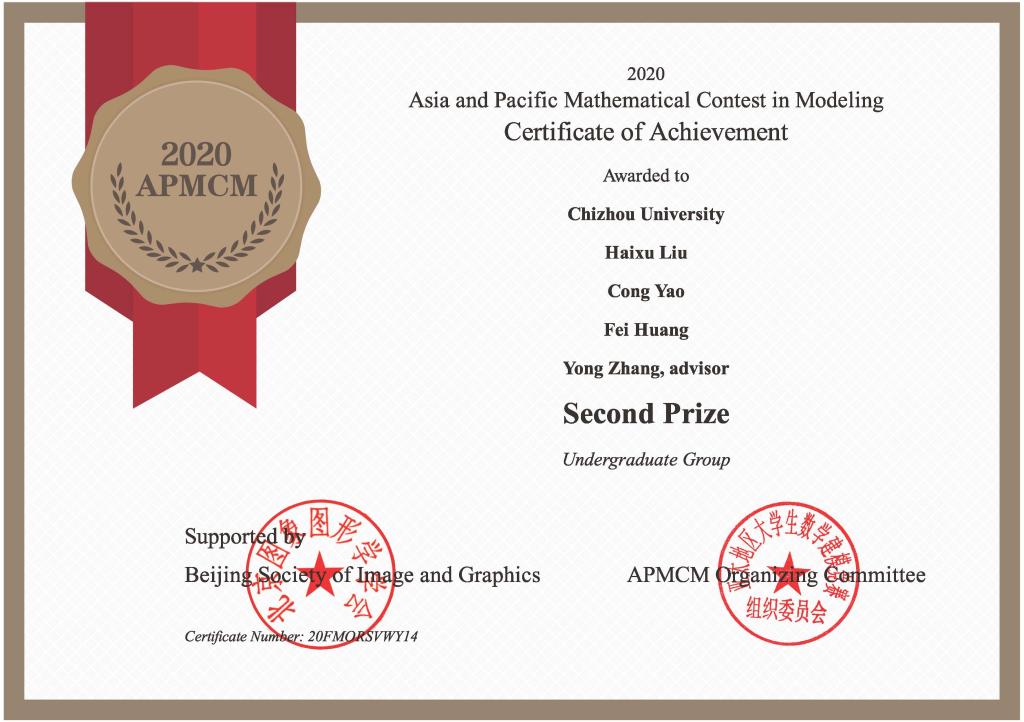近日,2020年亚太地区大学生数学建模竞赛成绩揭晓,永利官网学子喜获国际二等奖两项、三等奖一项。大数据与人工智能学院教师张永指导的刘海旭、黄斐、姚聪联队和包小兵指导的周月娥,冯筱惠,曹雨晴团队获得国际二等奖,张永指导的陈纪怡,刘莉芳,龚淑娟团队获得国际三等奖。