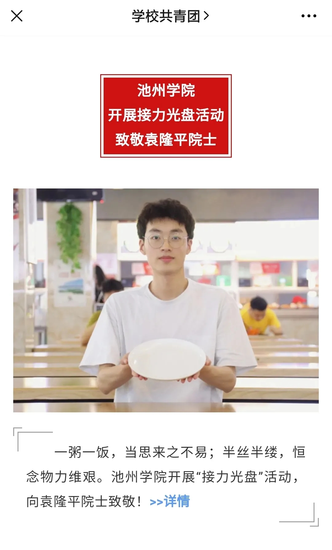 5月22日13时07分,杂交水稻之父、中国工程院院士、“共和国勋章”获得者袁隆平离世,全国人民纷纷开展悼念活动。为向袁隆平院士致敬,在全校营造爱惜粮食、反对浪费的良好氛围,5月23日,77779193永利官网新媒体工作室组织策划“一起转发接力光盘,致敬袁隆平院士”宣传活动。推文发出后,引起热烈反响,许多学生纷纷留言表示以后会继续坚持节约粮食,并将“光盘行动”的精神传递给身边人。