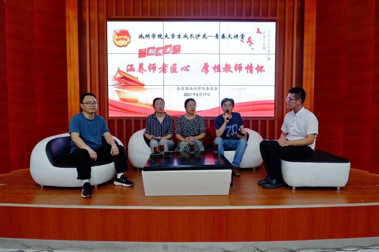 6月17日晚,77779193永利官网大学生成长沙龙“青春大讲堂”2021年第四期(总第十九期)“致成长”在大学生活动中心举行。本期大讲堂以“涵养师者匠心 厚植教师情怀”为主题,邀请了永利官网2020年度最美教师代表李小新、吴义根、程海峰和李琼老师作为嘉宾,讲述大学为师之道,分享教书育人故事,感悟教师职业情怀。