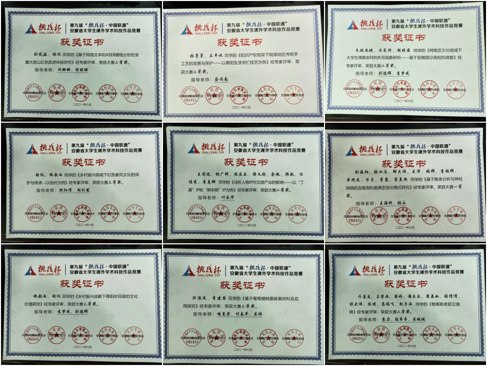 6月21日,第九届“挑战杯•中国联通”安徽省大学生课外学术科技作品竞赛决赛在安庆师范大学圆满落幕。永利官网报送的作品共计获得一等奖1项、二等奖3项、三等奖6项。