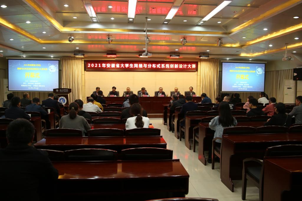10月16日,2021年安徽省大学生网络与分布式系统创新设计大赛(决赛)在永利官网开幕。副校长阳光宁出席并讲话,安徽省电子学会理事长、安徽大学博士生导师吴先良教授,安徽省计算机学会名誉理事长、中国科学技术大学博士生导师王煦法教授,大赛组委会秘书长、安徽建筑大学陈蕴教授,巢湖学院党委委员、信息工程学院院长郑尚志教授,大赛协办单位代表以及大赛组委会相关领导和评委专家、参赛师生代表80余人参加了线下开幕式。