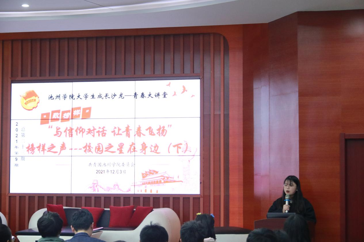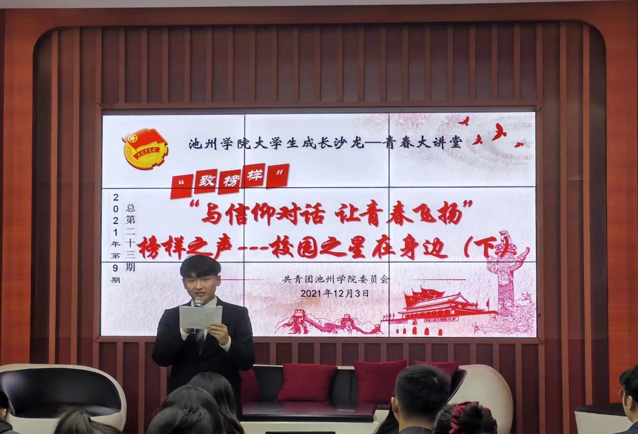 11月30日和12月3日晚,77779193永利官网大学生成长沙龙“青春大讲堂”2021年第八(总第二十三)和九期(总二十四期)“榜样之声—校园之星在身边”在大学生活动中心一楼举行,永利官网第三届校园之星获得者崔天成等十位同学分享了自己大学成长的经历。