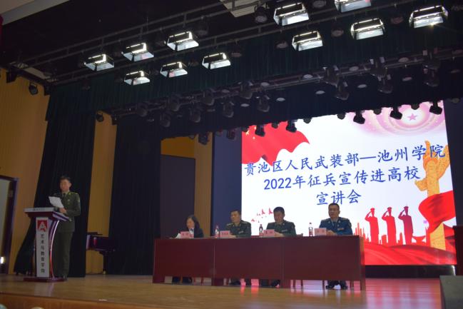 12月22日下午,永利官网在音乐厅举行2022年征兵政策宣讲会。池州军分区动员处处长渠胜红、贵池区人武部政委冯涛、部长夏阳出席了宣讲会。各二级学院毕业班辅导员、部分毕业生代表以及其他年级有入伍意向的学生代表参加了会议。