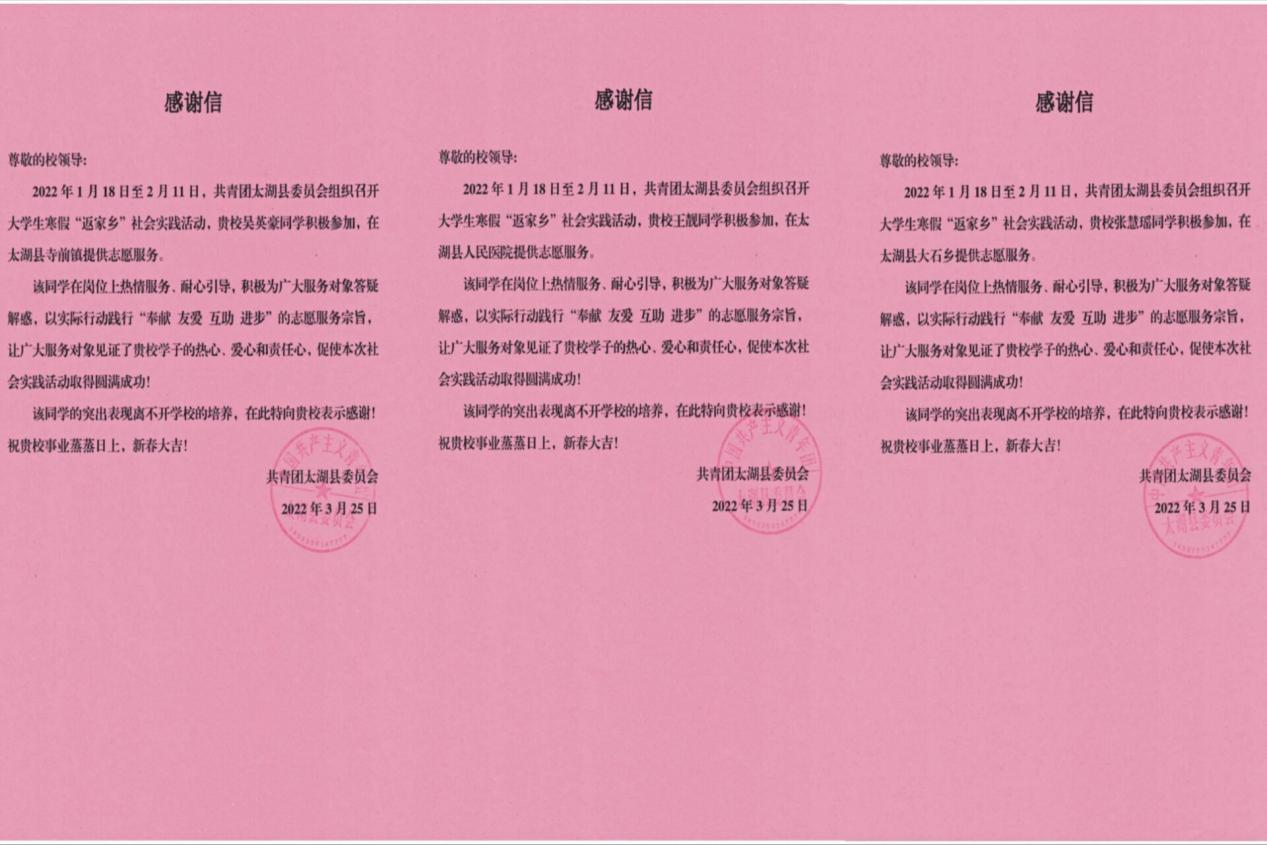 近日,永利官网收到共青团太湖县委员会发来的感谢信,表扬永利官网体育学院2020级社会体育指导与管理二班学生吴英豪、地理与规划学院2021级地理科学三班学生王靓、商学院2021级电子商务(对口班)学生张慧瑶等积极参加2022年寒假“返家乡”社会实践活动,勇于担当、积极奉献,用实际行动彰显了新时代大学生的责任与担当,并对永利官网的培养教育表示感谢。