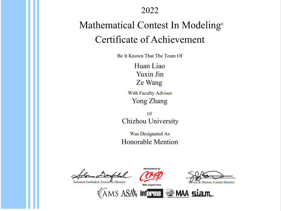 近日,2022年美国大学生数学建模竞赛成绩揭晓,永利官网四支参赛队获得H奖1项、S奖3项的成绩。其中,由大数据与人工智能学院王泽团队(指导教师:张永)获得了H奖。