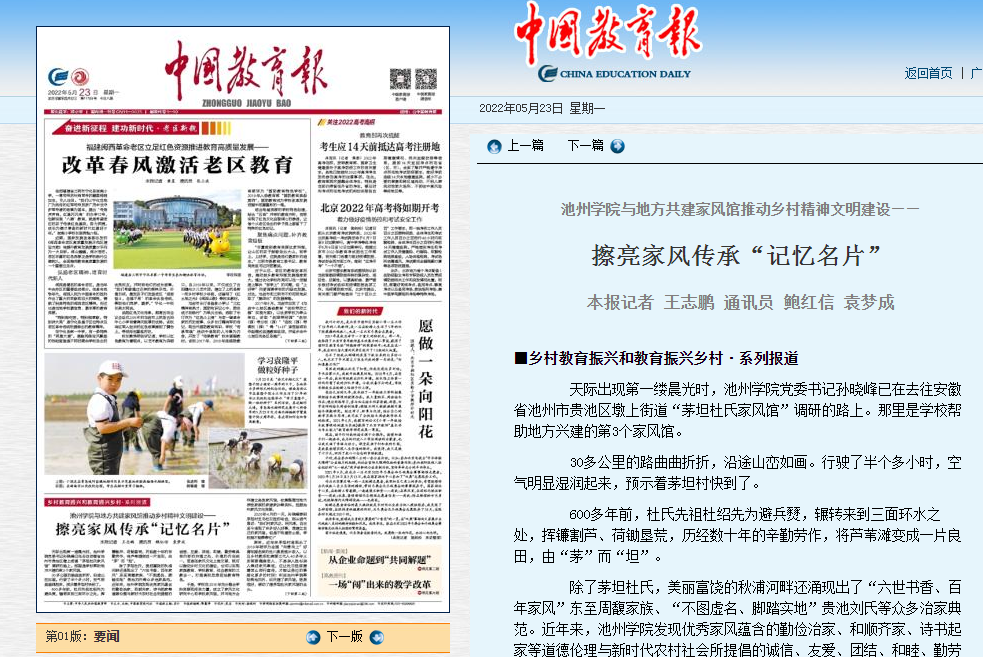于是,学校在2016年充分整合学科资源和师资力量,成立了家风文化研究中心和学校家风馆,并与地方合作建立各类家风馆,收集整理当地代表性家族的家谱家训等资料,挖掘池州家风文化资源。