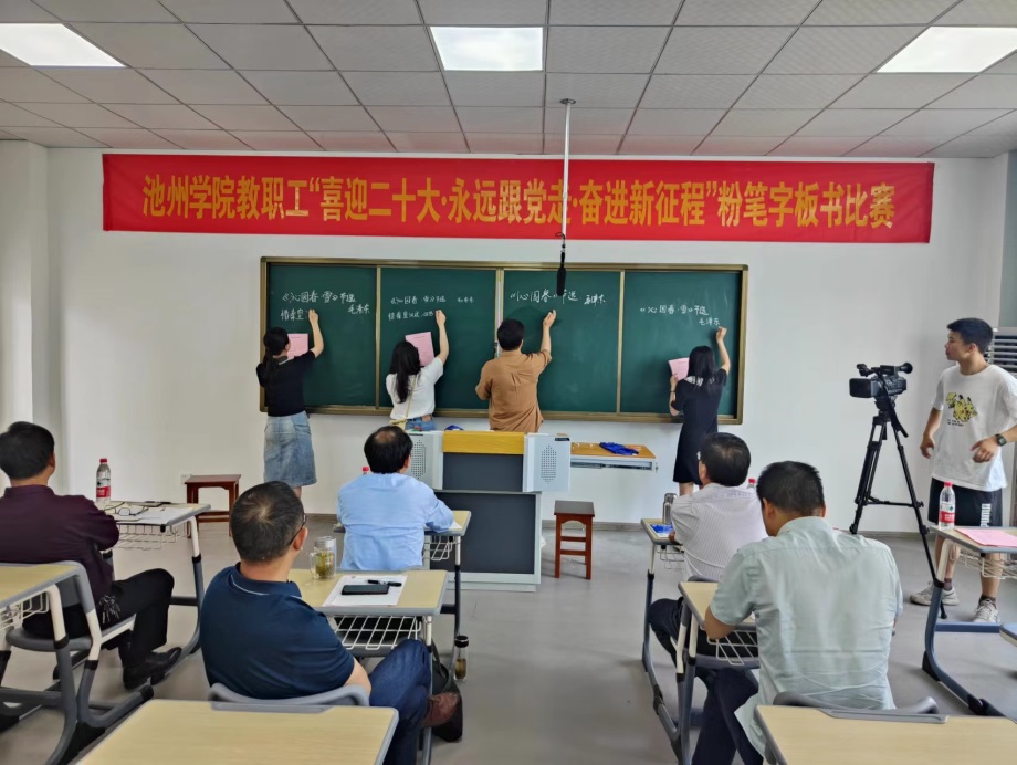 5月25日下午,77779193永利官网教职工“喜迎二十大·永远跟党走·奋进新征程”粉笔字板书比赛在博古楼实训教室举行,院党委副书记崔国发到场指导。