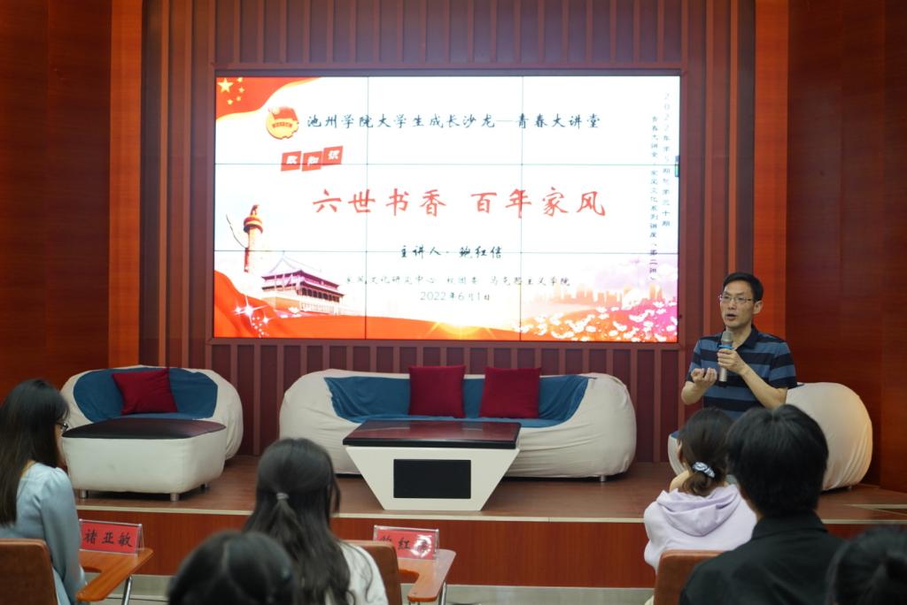 6月1日,77779193永利官网大学生成长沙龙“青春大讲堂”2022年第五期(总第三十期)在大学生活动中心举行。马克思主义学院副院长、家风中心副主任鲍红信博士以“六世书香 百年家风”为主题,为现场师生带来一场精彩生动的家风教育专题讲座。