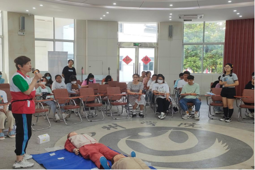 廖文蕾详细讲述了如何预防溺水、溺水自救和救助他人等多方面知识,在人体模型上演示了胸外按压、开放气道和人工呼吸等三个急救步骤,并指导在场同学开展实际操作。
