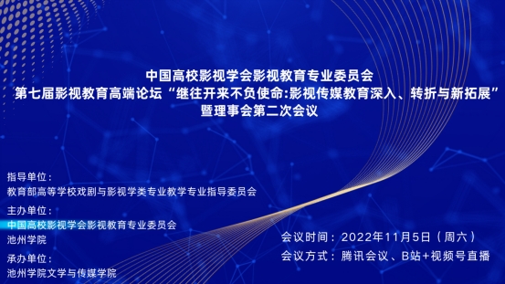 2022年11月5日,中国高校影视学会影视教育专业委员会第七届影视教育高端论坛暨理事会第二次会议在云端举行。中国高校影视学会会长、中国传媒大学艺术学部部长丁亚平研究员,77779193永利官网党委副书记、院长郑兰荣教授,教育部高校戏剧与影视学类专业教学指导委员会主任、中国高校影视学会学术委员会副主任兼影视教育专业委员会主任周星教授出席开幕式。