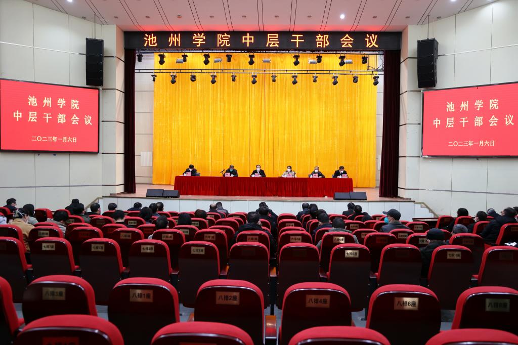 1月6日下午,学校在博古礼堂举行全体中层干部会议。院党委书记孙晓峰主持会议并讲话。院党委副书记、院长郑兰荣,院党委副书记崔国发,院党委委员、副院长阳光宁出席会议。