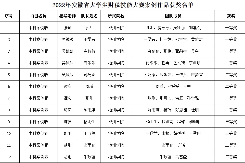 2月28日,2022年安徽省大学生财税技能大赛(省级B类赛事)评审结果公布,经大赛评审委员会初审、复审,商学院团队荣获一等奖4项、二等奖4项、三等奖4项,张璐、吴铖铖老师荣获“优秀指导教师”称号。