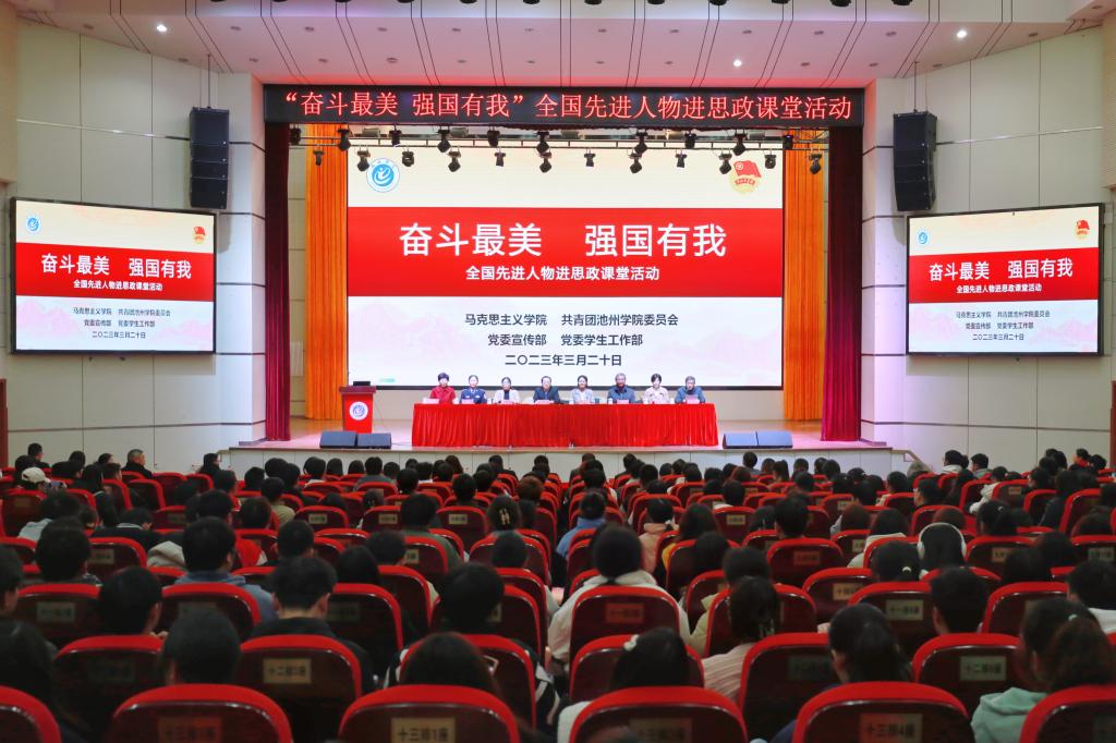 为深入学习贯彻党的二十大精神和全国两会精神,在学校掀起学习先进人物的热潮,构建生动活泼的大思政课堂。3月20日下午,永利官网联合池州市教体局举办的“全国先进人物进思政课堂”活动在博古礼堂举行,党的二十大代表路丙辉教授、全国人大代表丁德芬、全国语言推广先进个人秦红艳、全国妇联先进个人吴浩应邀做先进事迹宣讲报告。院党委书记孙晓峰出席并致辞,院党委副书记、院长郑兰荣,池州市教体局副局长许雪梅出席。院党委副书记崔国发主持宣讲会。办公室、宣传部、学生处、团委、马克思主义学院和各二级学院的领导以及辅导员代表、学生代表、池州市思政课教师代表等共600余名师生聆听了报告。