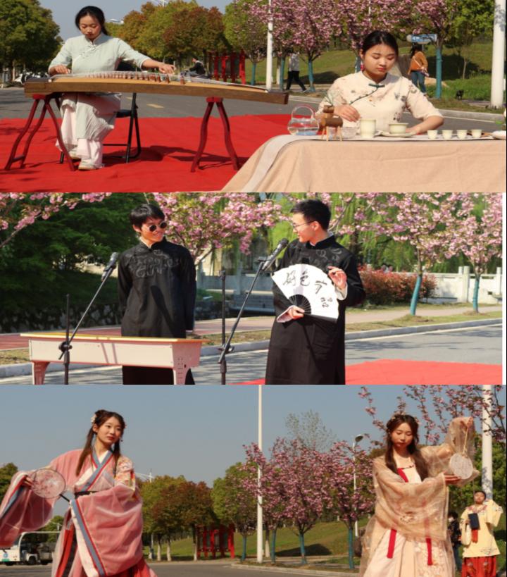 一曲轻快嘹亮、淳朴流畅的黄梅戏戏曲正式拉开了此次游园会的序幕。活动精彩纷呈,徽韵民乐社拨动琴弦,铮铮古音流淌于指间;茶艺社向同学们讲解传统制茶过程,悠悠茶香十里留芳;大艺团翩翩起舞,飘飘衣袂引动春风。