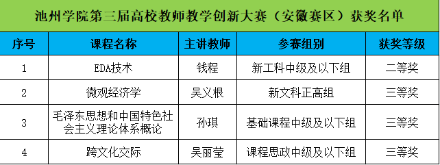 近日,第三届全国高校教师教学创新大赛安徽省决赛落下帷幕,永利官网参赛选手在大赛中表现优异,斩获二等奖1项、三等奖3项,创造了永利官网在该项赛事中的最佳成绩,其中机电工程学院(半导体学院)钱程教师团队荣获新工科中级及以下组二等奖、商学院吴义根教师团队荣获新文科正高组三等奖、马克思主义学院孙琪教师团队荣获基础课程中级及以下组三等奖、外国语学院吴丽莹教师荣获课程思政中级及以下组三等奖。