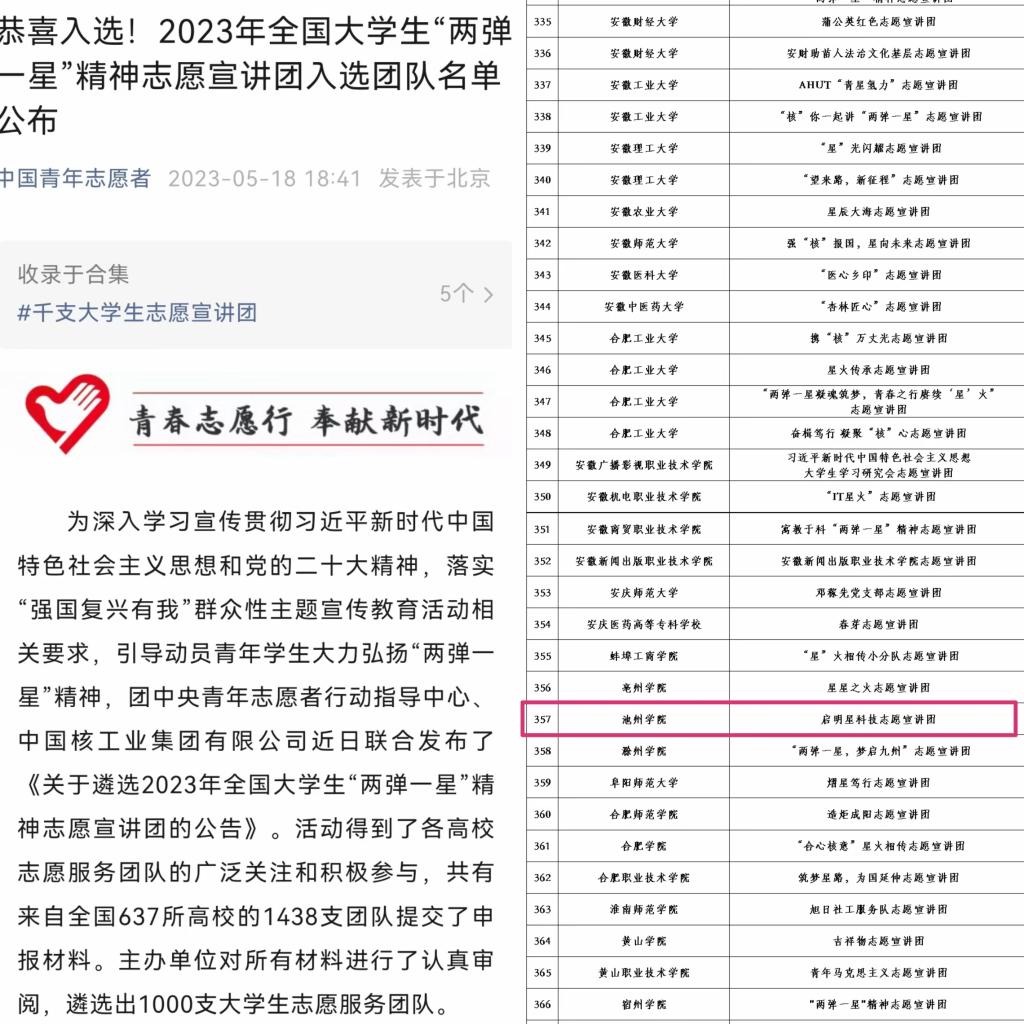 5月18日,团中央青年志愿者行动指导中心、中国核工业集团有限公司联合发布了《关于遴选2023年全国大学生“两弹一星”精神志愿宣讲团的公告》,永利官网材料与环境工程学院组织申报的“启明星科技志愿宣讲团”成功入选。