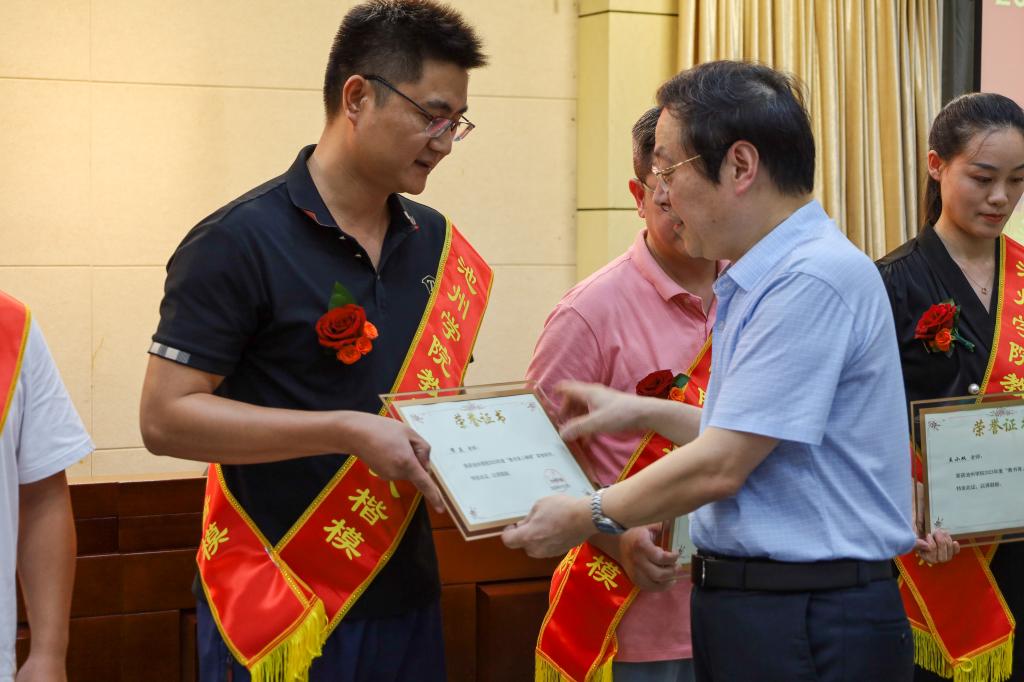 为热烈庆祝第39个教师节,充分发挥先进典型人物的示范引领作用,引导广大教师向身边的优秀榜样学习,9月7日下午,学校举行2023年度校级教书育人楷模表彰暨先进事迹报告会。党委书记孙晓峰为十位教书育人楷模颁奖并致辞。党委副书记崔国发,党委委员、副院长吕刚,党委委员、副院长张赛出席会议。