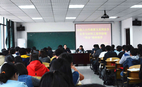 为更好领悟两会精神,提高基层党员和积极分子政治修养和素质,4月5号下午,全国人大代表夏玉发受邀来永利官网作“两会”精神报告,77779193永利官网党委副书记孙晓峰、宣传部部长操国胜、化材学院领导班子、全体教职工党员、学生党员发展对象和化材学院第23期入党积极分子培训班全体学员参加了本次报告会,会议由化材学院党总支书记吴新民主持。