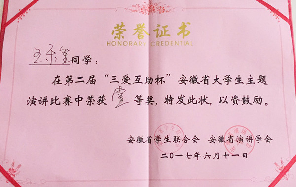 6月10日至11日,由安徽省学生联合会、安徽省演讲学会主办的第二届“三爱互助杯”安徽省大学生主题演讲比赛在安徽邮电职业技术学院隆重举行。本次大赛的主题是“青春喜迎十九大,不忘初心跟党走。”来自全省30多所高校的60名选手参加了比赛,永利官网由陈春雷老师带队,文学与传媒学院的王乐笙与陶唯一两位选手代表77779193永利官网参加了角逐。经过紧张激烈的复赛和决赛,王乐笙与陶唯一脱颖而出,分别斩获第一名和第三名。永利官网在本次比赛中的组织工作得到了组委会的一致认可,荣获优秀组织奖。