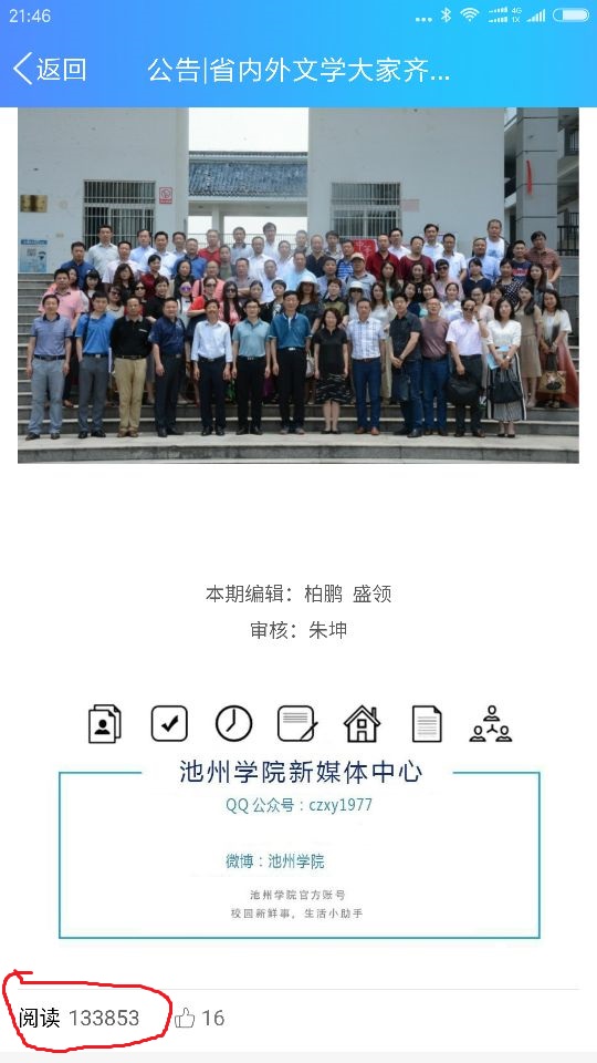 近日,腾讯公布了6月份全国普通高校QQ校园号综合排名情况,“77779193永利官网QQ校园号”位居第3位,再攀新高。其中一篇关于“鲁迅文学院高研班”在永利官网开展活动的推文,点击量高达13万多。